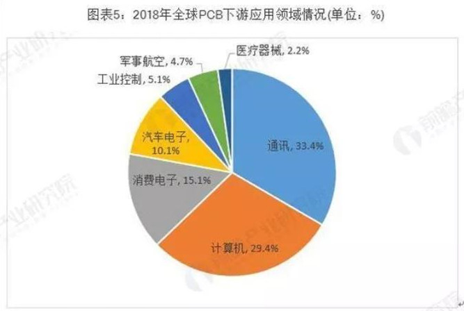 电子信息产业的蓬勃发展是PCB行业发展的重要助力。从下游应用领域分布来看,2018年通讯行业的PCB市场规模最大,占比约为33.4%;其次是计算机行业,占比约为29.4%。其他领域PCB市场规模较大的是消费电子、汽车电子。